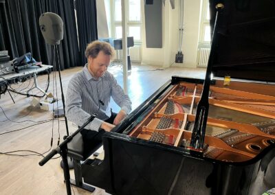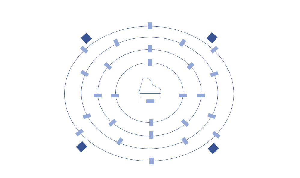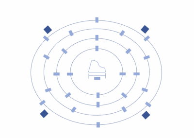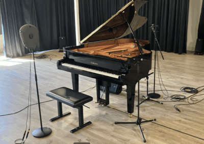 Lors de la restitution publique du 30 octobre 2025, nous avons proposé deux versions : la première avec les auditeurs disposés en cercle autour du piano, chacun occupant une position d’écoute fixe ; la seconde en incitant le public à se déplacer librement, permettant à chacun de s’approprier à sa manière l’idée d’« écoute spatiale ».