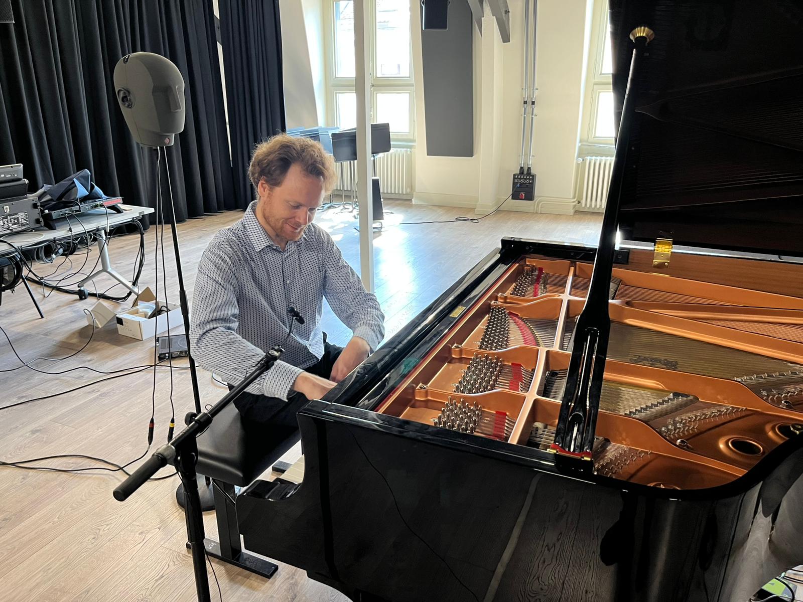En août 2025, avec le compositeur et réalisateur en informatique musicale Benjamin Gueit, j’y ai mené une résidence de recherche centrée sur trois objectifs : spatialiser la bande originale, modifier l’acoustique de manière à influencer mon interprétation du piano live, générer depuis le Disklavier une nouvelle bande sur laquelle je puisse improviser en retour. Pour préparer ce travail, j’ai étudié en profondeur l’œuvre de Nono, notamment les analyses de Paulo de Assis, afin de m’approprier sa structure et ses matériaux. Dans la Blackbox, nous avons décidé de placer le piano au centre du dôme, position d’écoute privilégiée. L’ajout d’un haut-parleur sous le piano nous a même permis de créer des trajectoires sonores non seulement sur, mais aussi dans le dôme — possibilité normalement inaccessible en ambisonie.